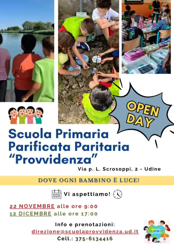 Nella convinzione che «l’educazione non è solo trasmissione di contenuti, ma apprendistato di virtù» e che «le scuole siano laboratori di profezia» (papa Leone), durante il corrente a.s. 2025-2026 questa Primaria “Collegio della Provvidenza” (dove ogni bambino è luce!) propone a tutte le famiglie/persone interessate delle giornate di “Scuole Aperte”: chi come noi crede in un’educazione centrata sui valori umani e cristiani avrà così l’opportunità di scoprirne o riscoprirne gli ampi spazi (una location confortevole), l’intero progetto educativo d’istituto (una mission condivisibile) e soprattutto la qualità, la flessibilità e l’ampia varietà dell’offerta formativa.